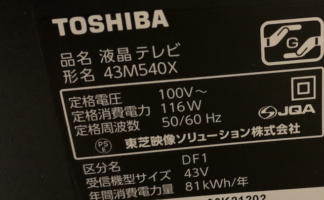 そして、部屋のテレビは、43インチの4Kテレビが設置されている。4K画像の良さを再認識した。そして、つい電機メーカーに勤めていた性なのか、規格銘板の写真も撮ってしまった。