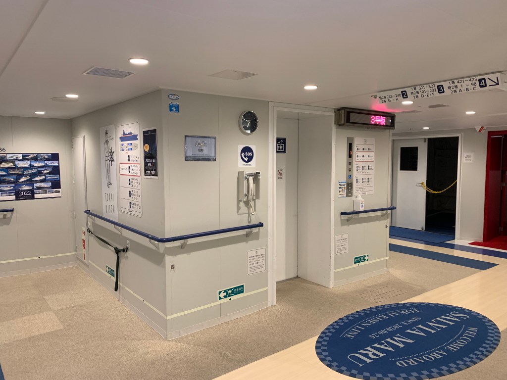 パソコンを開いて作業できる場所は、レストランのテーブルくらいで、他にはなさそうだ。まあ、もっとも多くの乗客が降りる伊豆大島には午前6時に到着してしまうので、そんな時間はあまりないのだが。