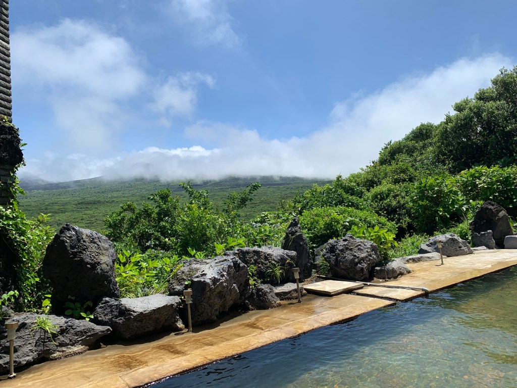十分に歩き回ったので、ホテルに戻って温泉だ。夕方の三原山を眺めながら、温泉に入る。最高である。