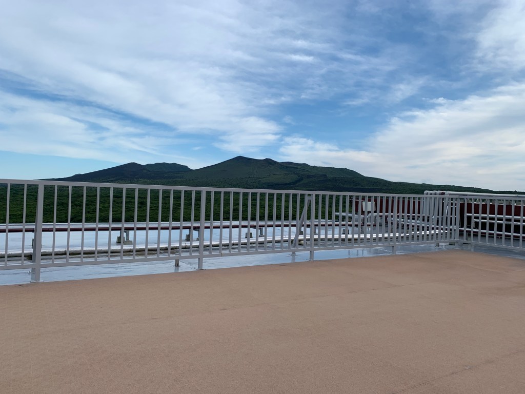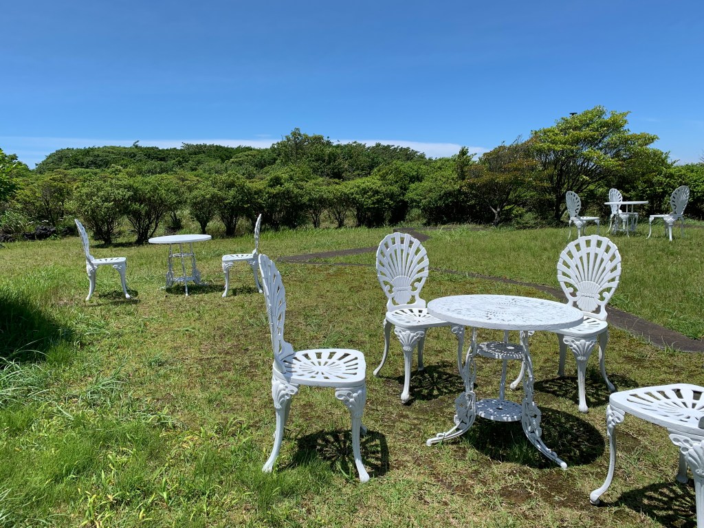 ホテルの前にテーブルと椅子が用意され、三原山を眺めながら優雅なひとときを過ごせそうだったが、直射日光がこの時期強く、誰も使う人はいない。