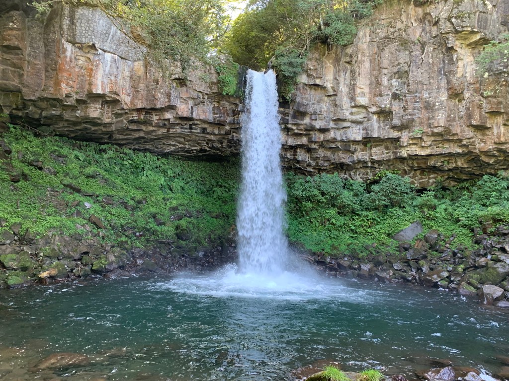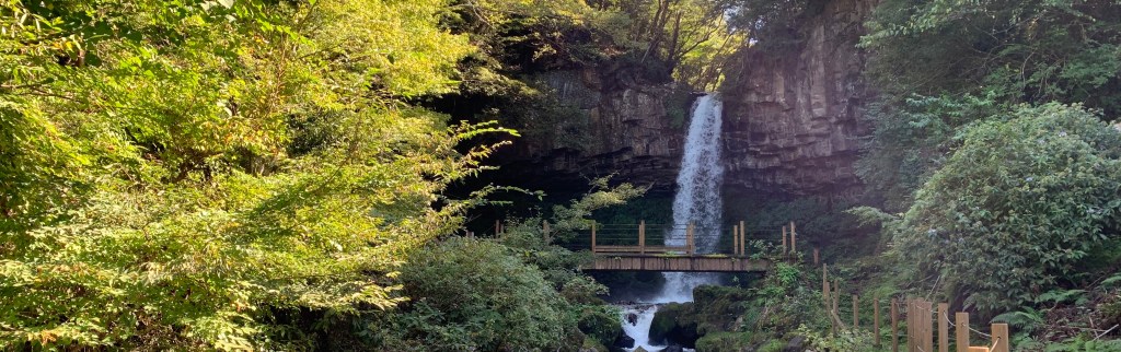 崩落防止のために柱状節理の溝をモルタルで埋める補強工事が行われてしまい、自然そのものの姿は残っていないのですが、見た目にはよくわかりませんね。以前は滝の裏にも行けたようです。