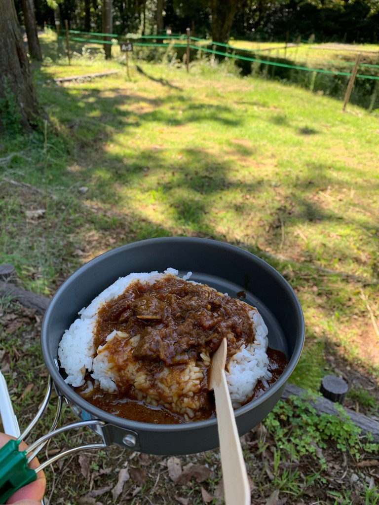 思い立って来たので、忘れものばかり。さあ、カレーを食べようとお湯を沸かそうとしたら、なんとバーナーは持ってきたものの、ガスを忘れた。管理棟に行くとガスが売っていたので購入。さてカレーもご飯も温かくなったので、食べようと思ったら、なんとスプーンを忘れてた。また管理棟に行って、木製のスプーン購入。