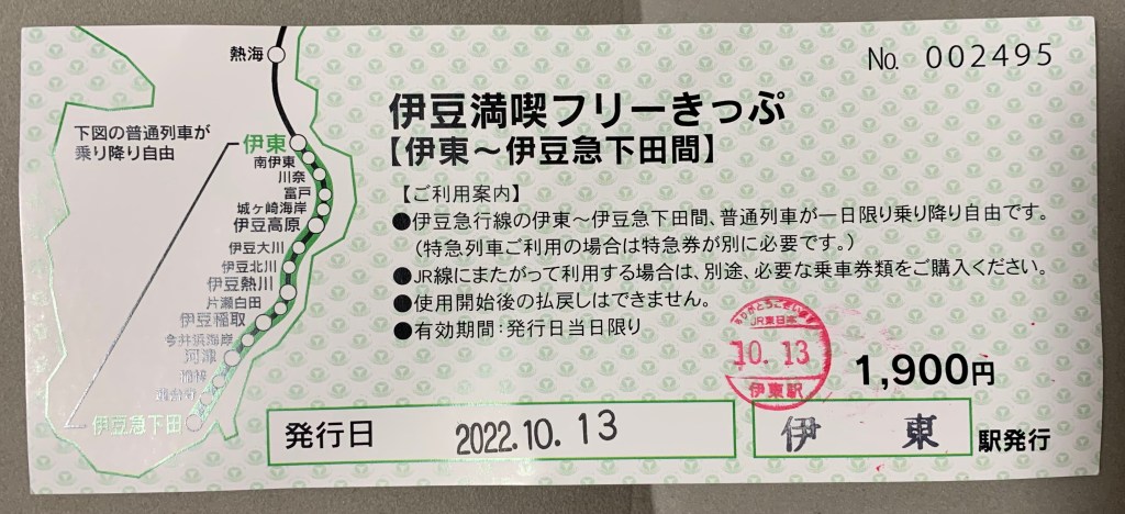 東伊豆の今井浜海岸にやってきた。伊東駅で伊豆急行のフリー切符を購入。1,900円で伊豆急下田までは往復可能で、乗り降り自由だ。今回は、今井浜海岸までの往復だが、それでも圧倒的に得だ。普通に購入すれば、伊東から今井浜までは1,394円で往復2,788円だ。それが1,900円。買わない手はない。