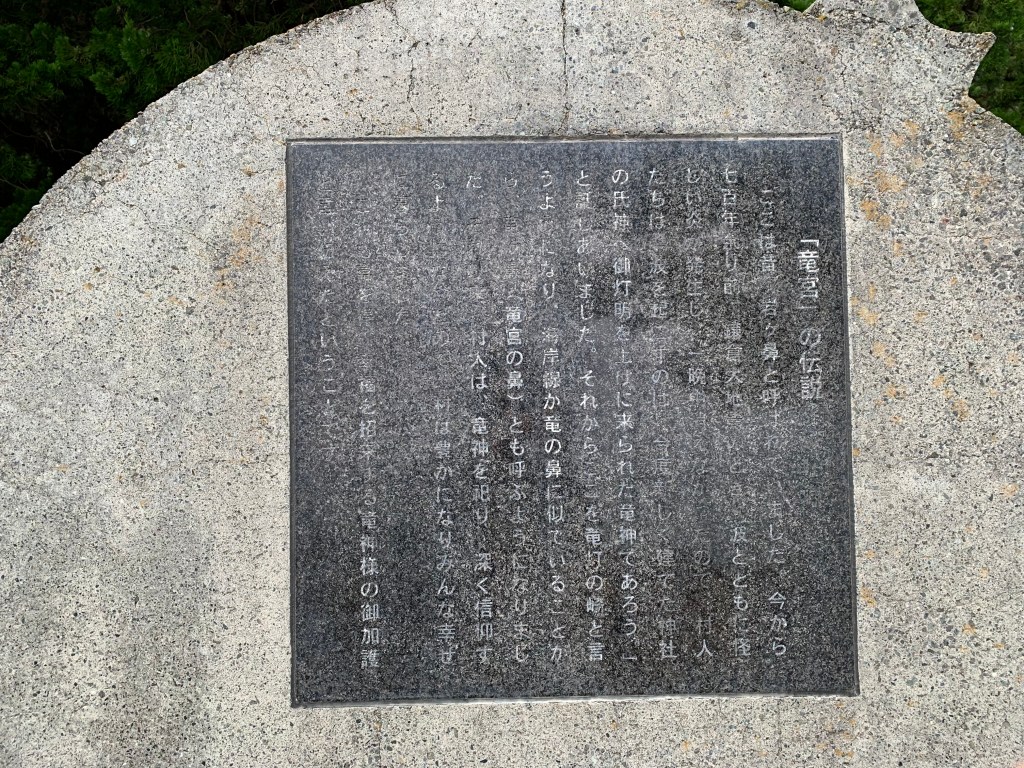 竜宮の伝説の書かれた石碑が海岸沿いにある。伝説の解説が書いてあるのだが、掠れていて一部読めない。この辺りも民宿もあり、夏は賑やかなのだろう。