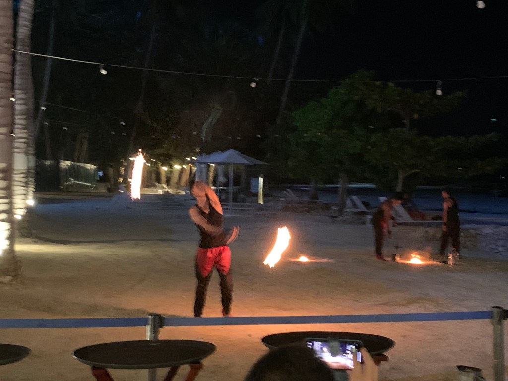 夜になると、ビーチに机と椅子が用意され、ビーチパーティーの始まりだ、日が沈んで風もあるので快適だ。炎のダンスでパーティーが始まる。もちろん生で演奏と歌が流れ、照明も適度にされているので、贅沢な時間だ。シンガポールから来たという欧米人の男性と英語で話しながら、英語はすごく流暢だが、英国系の会社に勤めている割には、イギリス英語ではないなと思い、出身を聞いたところ、フランス人であることがわかった。しかし、まったくフランス人とは思わせない見事な英語を喋る。彼にビールを奢ってもらい、盛り上がり、そして夜は更けていく、