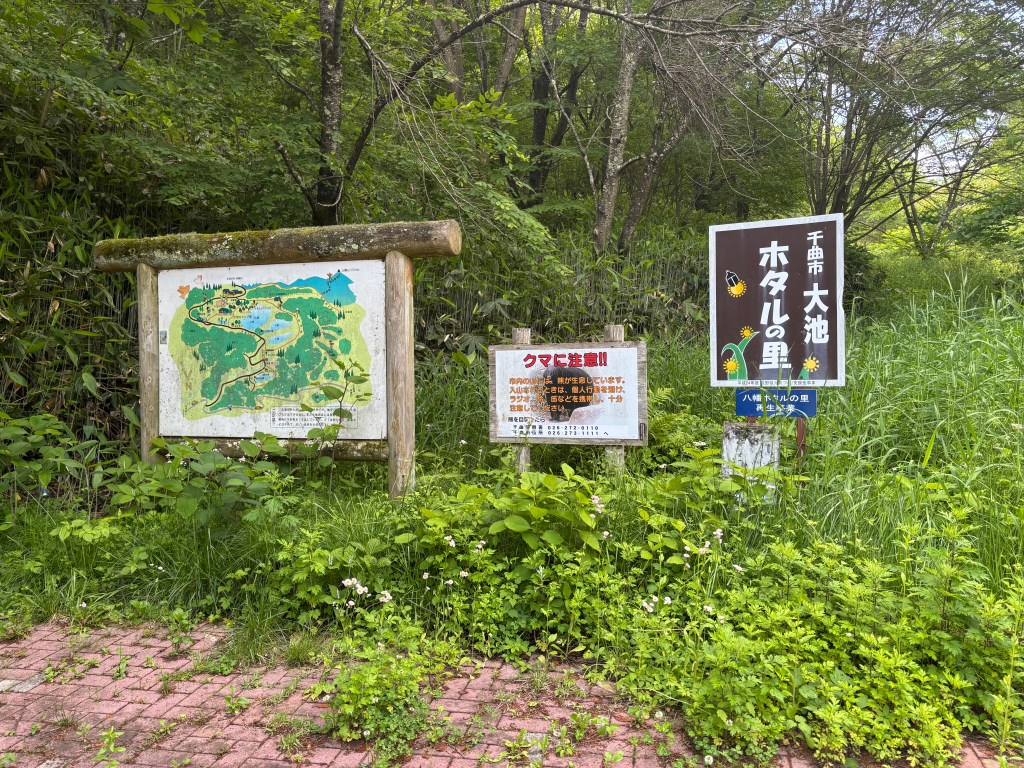 近くに大池を代表とするいくつかの池があり、その周辺を散策できる。平日なので。ほとんど観光客に会うこともなく、散策できる。2時間歩いても誰にも会わず、車道を歩いていても、出会う車はわずかである。ところどころに休憩用のあずま屋があり、そこで作業も可能かもしれない。ただし、夏は虫がかなり来そうである。