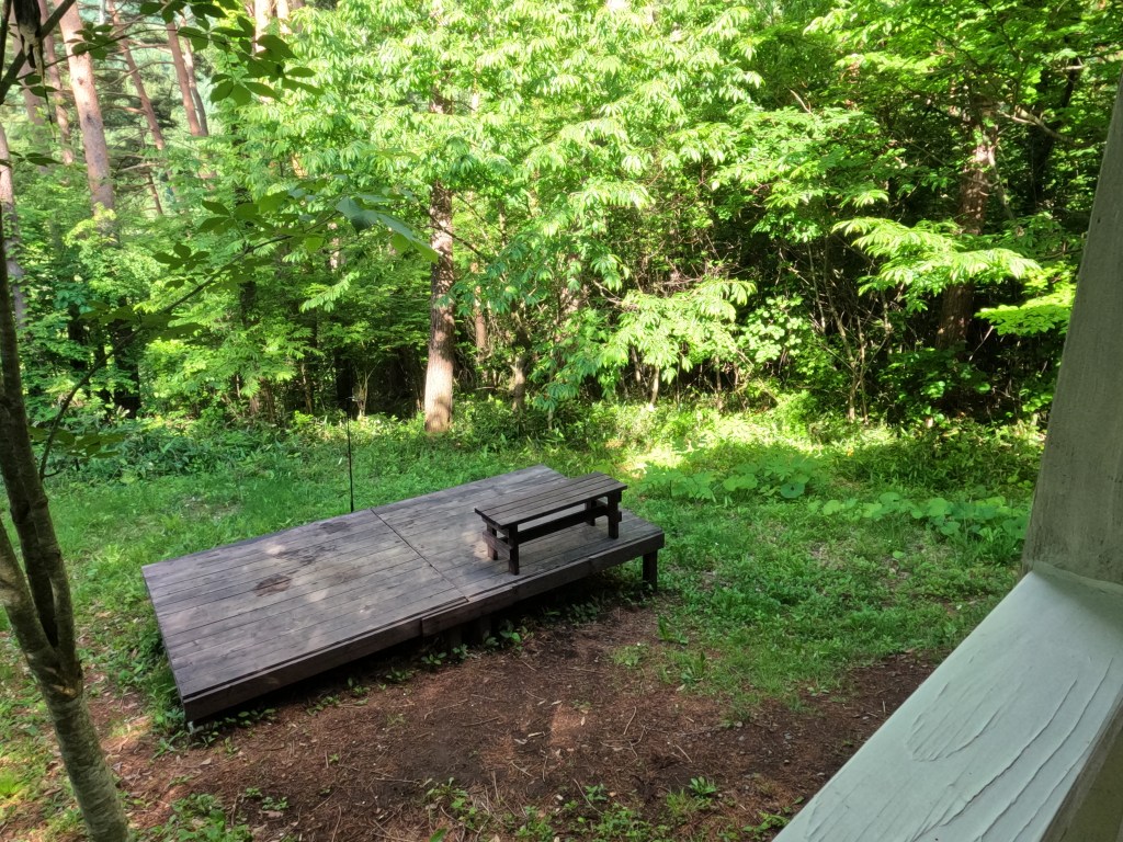 環境としては非常に静かである。裏にバーベキュー等を想定したデッキがあり、長椅子が置いてある。ここで作業するには、やはりテーブルが欲しいところ。ここで作業できれば、非常に快適じゃないかと思う。