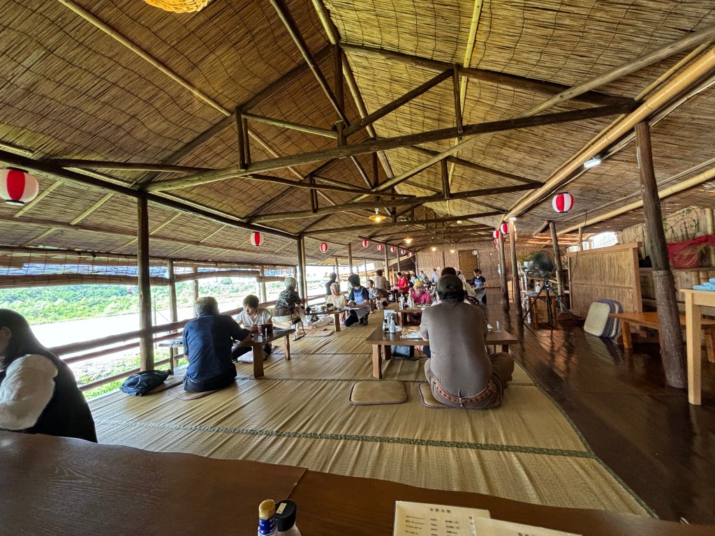 朝9時頃、比較的ゆっくりしたスタートだ。高速道路を高崎の少し向こうの渋川まで走る。晴れていて快適なドライブだ。渋川のインターチェンジで降りる。目当ては昼食に鮎の塩焼きの有名店に行き、食べることだ。店の名前は、「落合梁」。細い道を越えると比較的広い店の前の駐車場に出る。まだ昼まで少し時間があり、平日なので空いている。予約していなかったが、すぐに通してくれた。目の前を川が流れる桟敷席だ。塩焼き、酢漬け、天ぷら、煮付けなどフルコースで頂く。本当はビールでも飲みながら食べたいところだが。